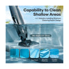 Equipada con una succión de 1260 GPH (≈4800 LPH), elimina hojas, arena, suciedad y partículas finas con total facilidad. Su cabezal flexible alcanza esquinas, curvas, bordes y escalones.